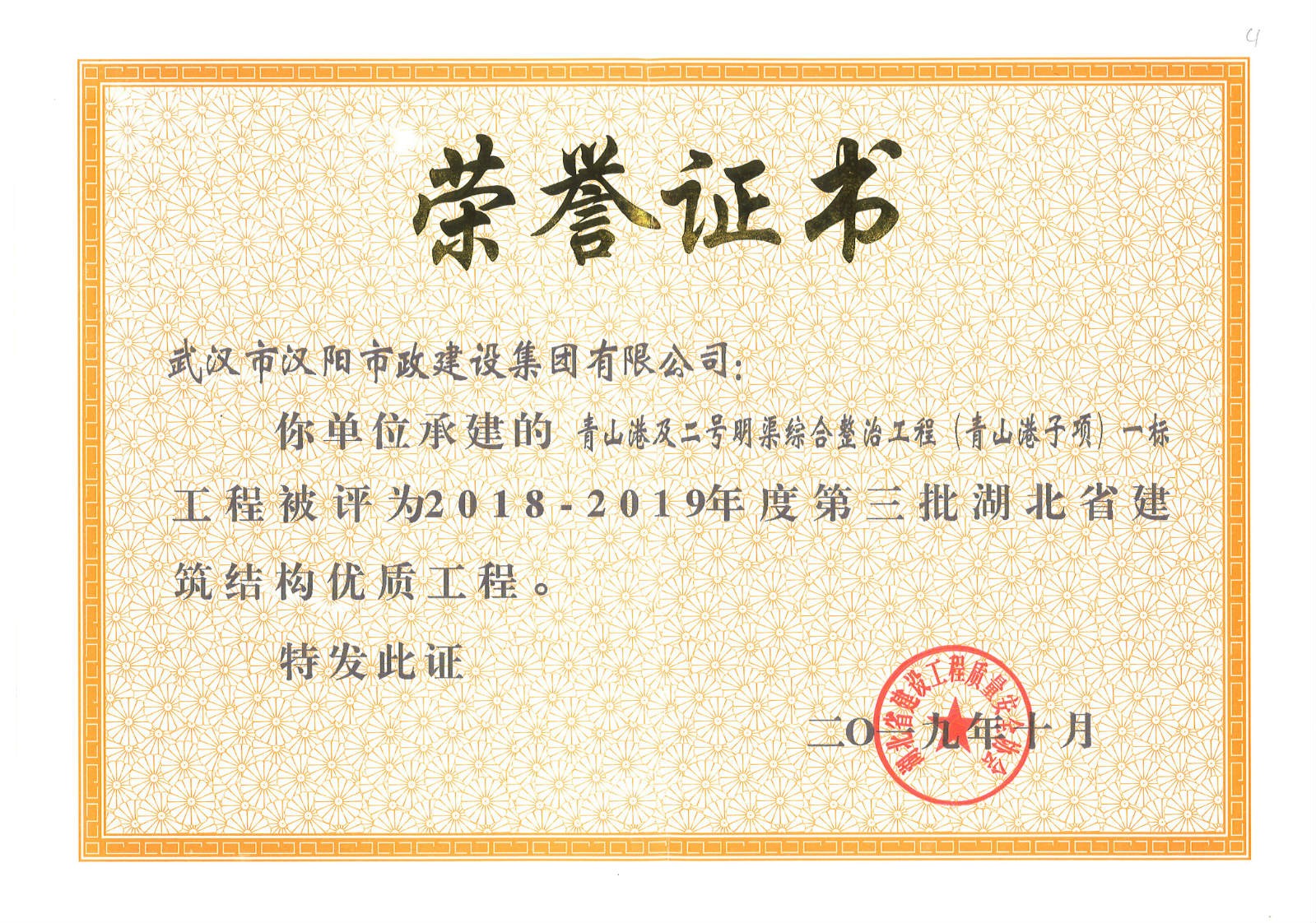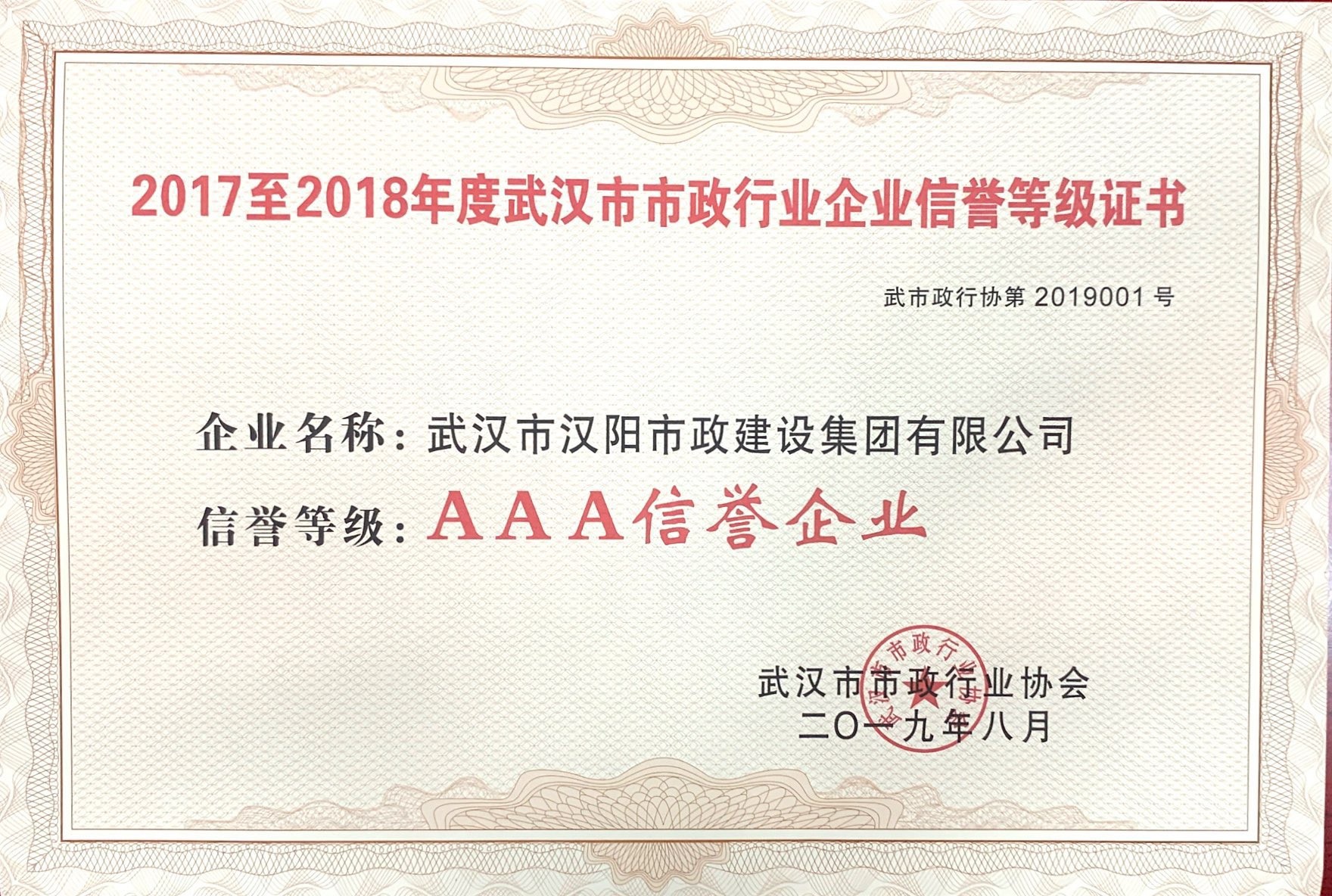 武漢市市政行業(yè)企業(yè)信譽(yù)等級(jí)證書