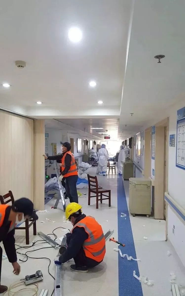 ? ? ? 2月17日下午,在舊樓住院部其余樓層完成消毒之后,項(xiàng)目人員再次緊急前往醫(yī)院,進(jìn)行第二階段的施工,項(xiàng)目人員連軸轉(zhuǎn)直至第二天清晨。2月18日上午,為了嚴(yán)格貫徹上級(jí)“寧可讓床等人,也不要讓人等床”的指示,院方?jīng)Q定再新增一棟樓作為備用,在方案確定之后,公司積極響應(yīng),同步啟動(dòng)第三階段施工,由于時(shí)間緊、任務(wù)重,公司從其他收尾項(xiàng)目抽調(diào)了10余名管理人員,60多名工人進(jìn)行人員補(bǔ)充,確保了新樓舊樓同步施工。