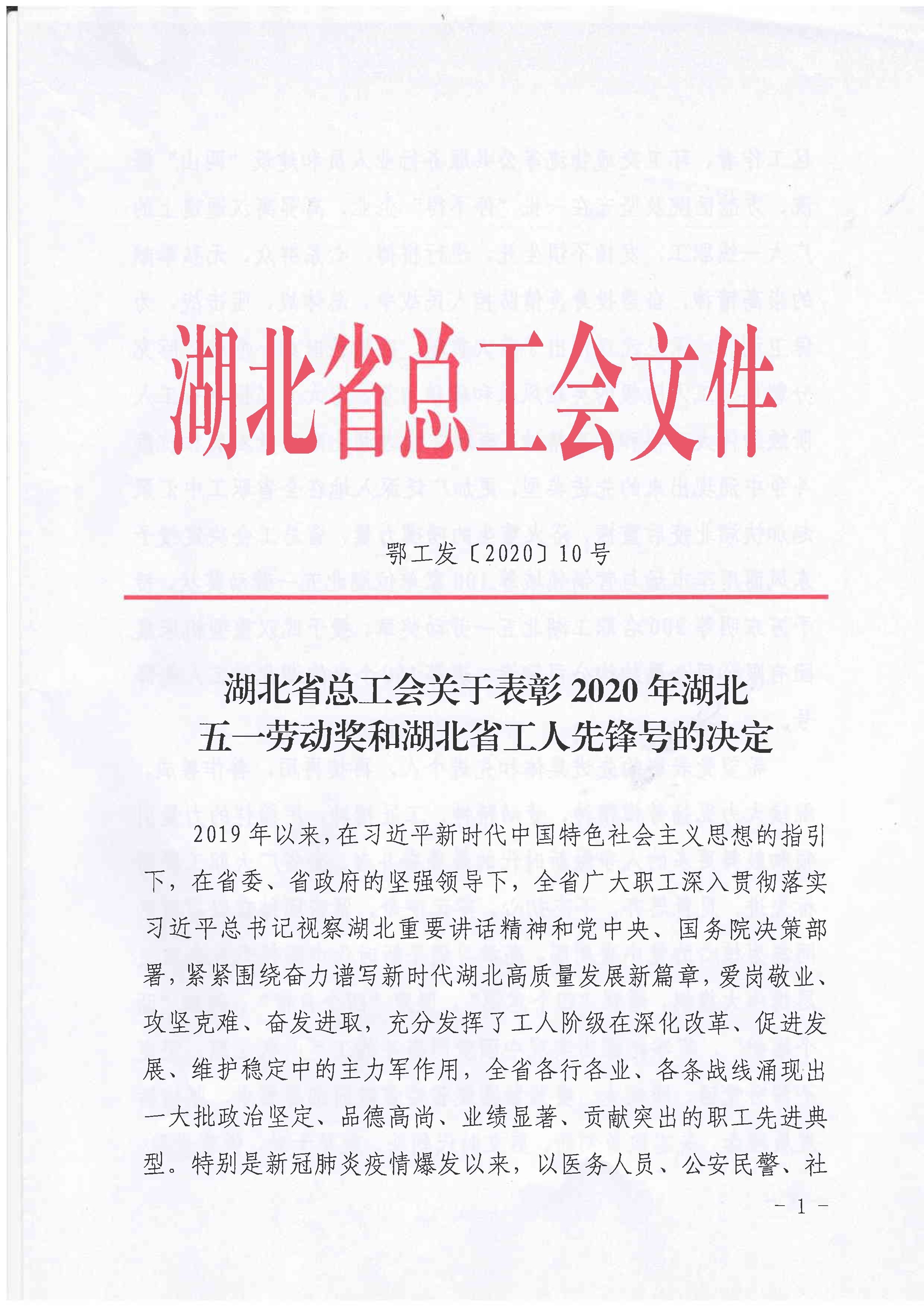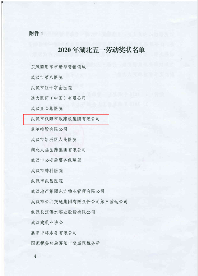 4月27日,湖北省總工會(huì)發(fā)布《關(guān)于表彰2020年湖北五一勞動(dòng)獎(jiǎng)和湖北省工人先鋒號(hào)的決定》(鄂工發(fā)〔2020〕10號(hào)),武漢市漢陽(yáng)市政建設(shè)集團(tuán)有限公司榮獲2020年湖北五一勞動(dòng)獎(jiǎng)狀榮譽(yù)。