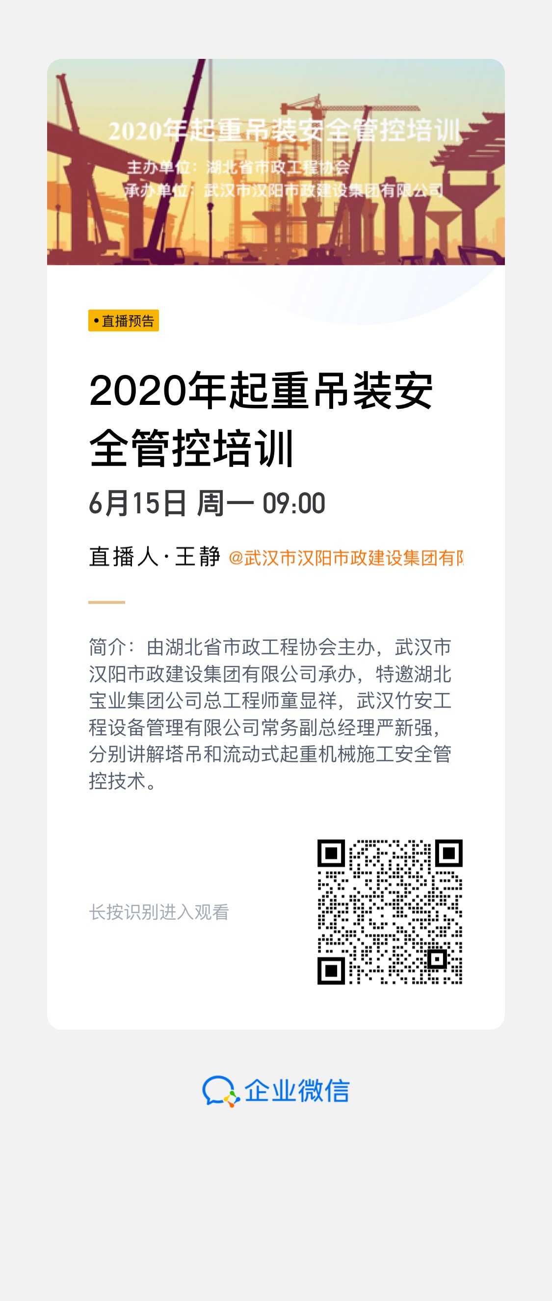 ? ? ? 培訓(xùn)采用現(xiàn)場授課與企業(yè)微信線上同步直播的方式進(jìn)行。線上直播在組織內(nèi)部人員觀看的同時,還通過湖北省市政工程協(xié)會線上平臺,吸引了更多同行管理人員的觀看,累計(jì)共有604人次觀看。