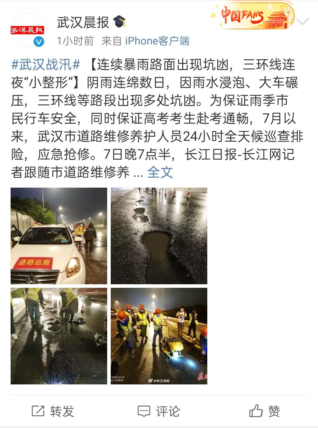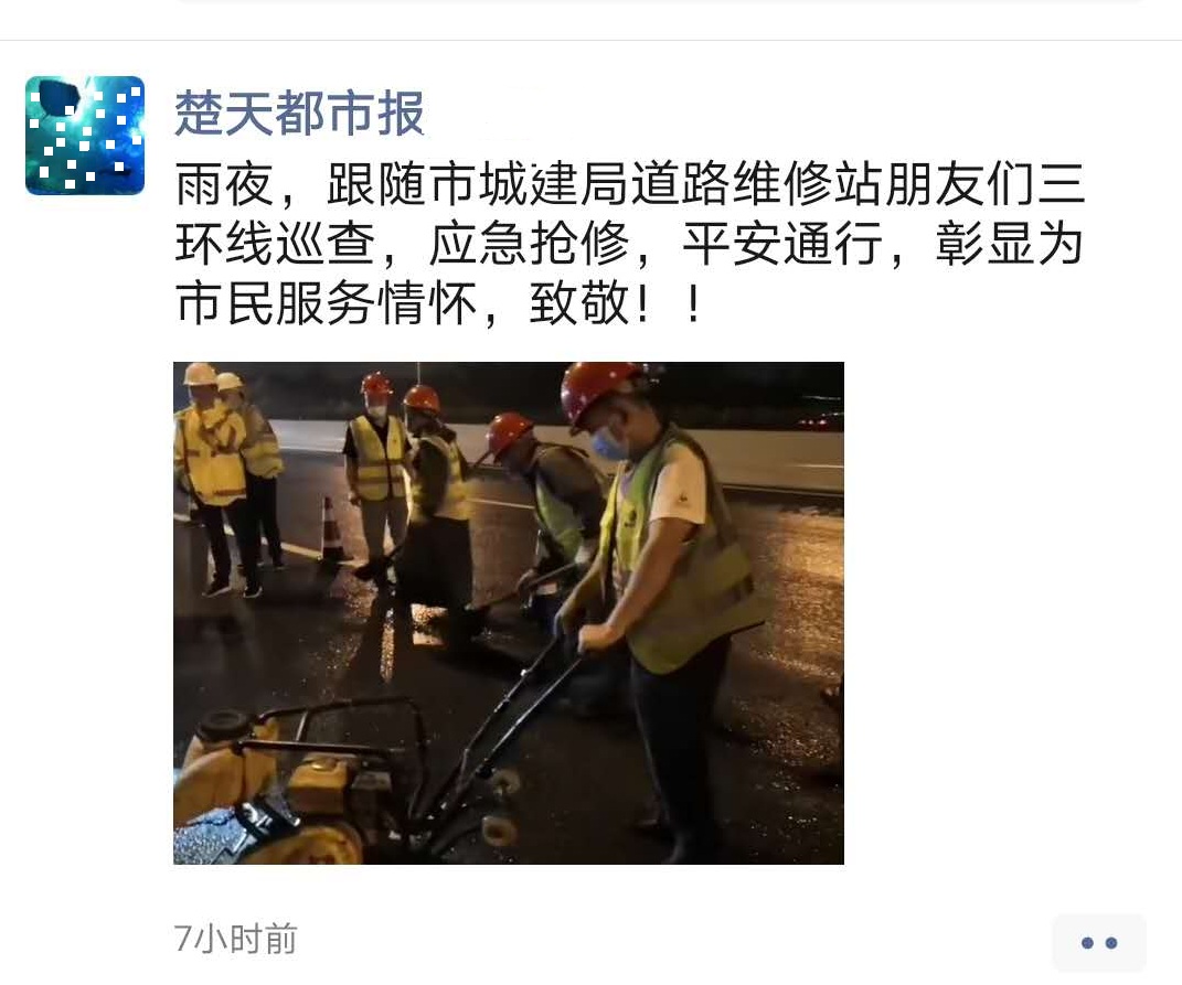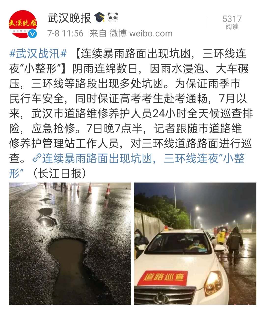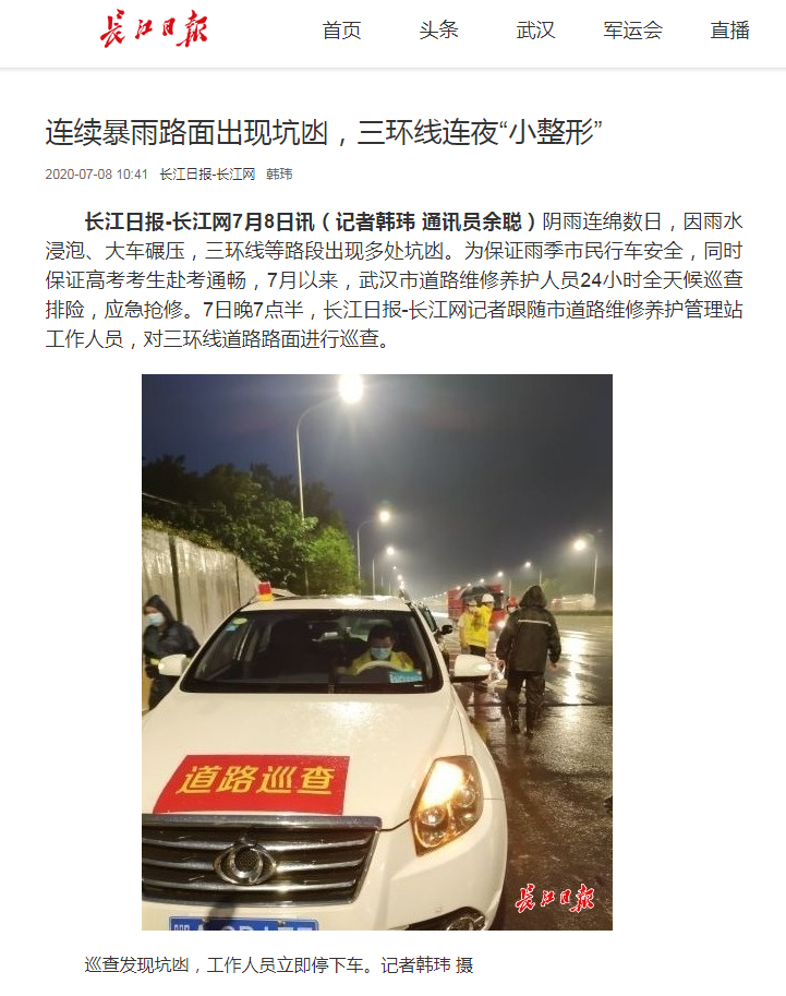 ? ? ? 近日,武漢市陰雨連綿,許多路段因雨水浸泡、車輛碾壓等出現(xiàn)坑凼,嚴(yán)重影響了交通安全。為保障雨季市民行車安全,助力高考考生赴考通暢,7月以來,漢陽市政六公司24小時全天候巡查排險,提前預(yù)防、提前搶修,積極修復(fù)受損路段,做到應(yīng)急搶修不斷檔,獲得了民眾的一致好評,并被《長江日報》《武漢晨報》《武漢晚報》《楚天都市報》等主流媒體報道。