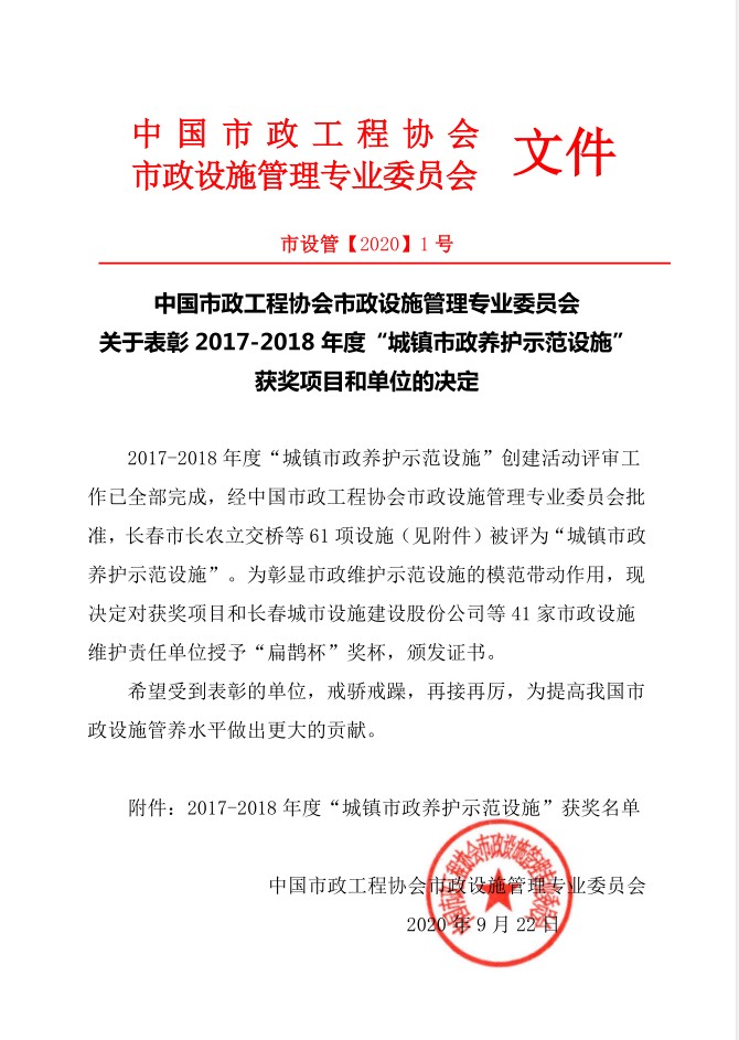 2017-2018 年度全國“城鎮(zhèn)市政養(yǎng)護(hù)示范設(shè)施”創(chuàng)建活動—— “扁鵲杯”獎獲獎名單(部分)