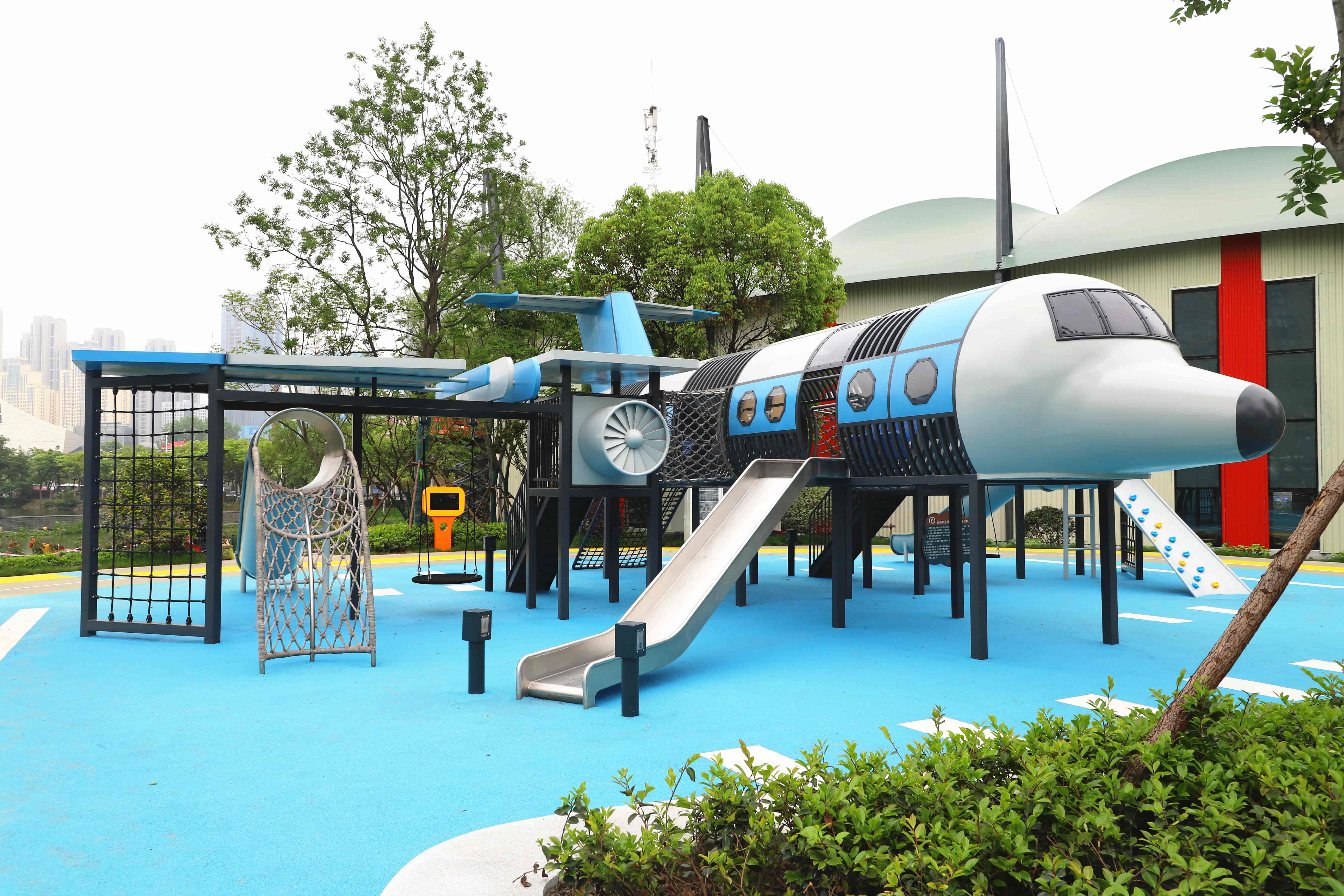 在公園的中間地帶,是兒童和青少年活動(dòng)區(qū)。這里有直升機(jī)、運(yùn)輸機(jī)等形狀的游樂設(shè)施,還有各色的卡通動(dòng)畫秋千及座椅,既融入了軍事元素體現(xiàn)張之洞文化,又富有童心,展現(xiàn)了青春與活力。