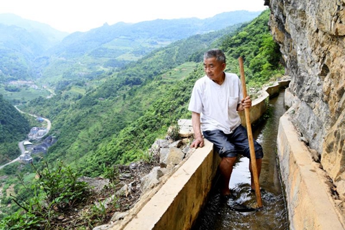 我從當(dāng)上村干部的那一天起,就立下誓言,要為鄉(xiāng)親們干三件事:引水、修路、通電。我用了整整36年時(shí)間,帶領(lǐng)鄉(xiāng)親們?cè)诿钌街行蘖艘粭l水渠,這條水渠繞過(guò)3座山頭、穿過(guò)3道絕壁,引來(lái)清亮甘甜的清泉,滋潤(rùn)了祖祖輩輩干渴貧窮的草王壩村,我因此被鄉(xiāng)親們稱為“當(dāng)代愚公”。