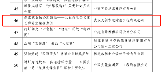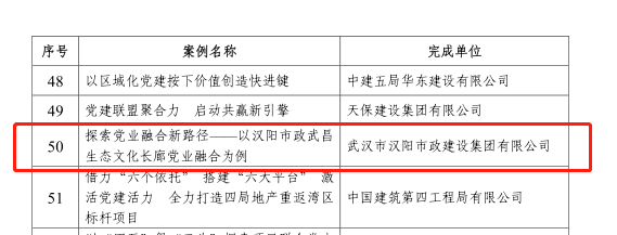 近日,中國施工企業(yè)管理協(xié)會發(fā)布《關(guān)于推廣工程建設企業(yè)黨建工作最佳案例和優(yōu)秀案例的通知》,漢陽市政3項黨建案例榜上有名。其中,《探索黨業(yè)融合新路徑—以漢陽市政武昌生態(tài)文化長廊黨業(yè)融合為例》成功入選工程建設企業(yè)黨建工作最佳案例,《探索黨業(yè)融合新路徑—以武昌生態(tài)文化長廊黨業(yè)融合為例》《“宏心領航”,從黨史學習教育中汲取奮進力量》入選工程建設企業(yè)黨建工作優(yōu)秀案例。