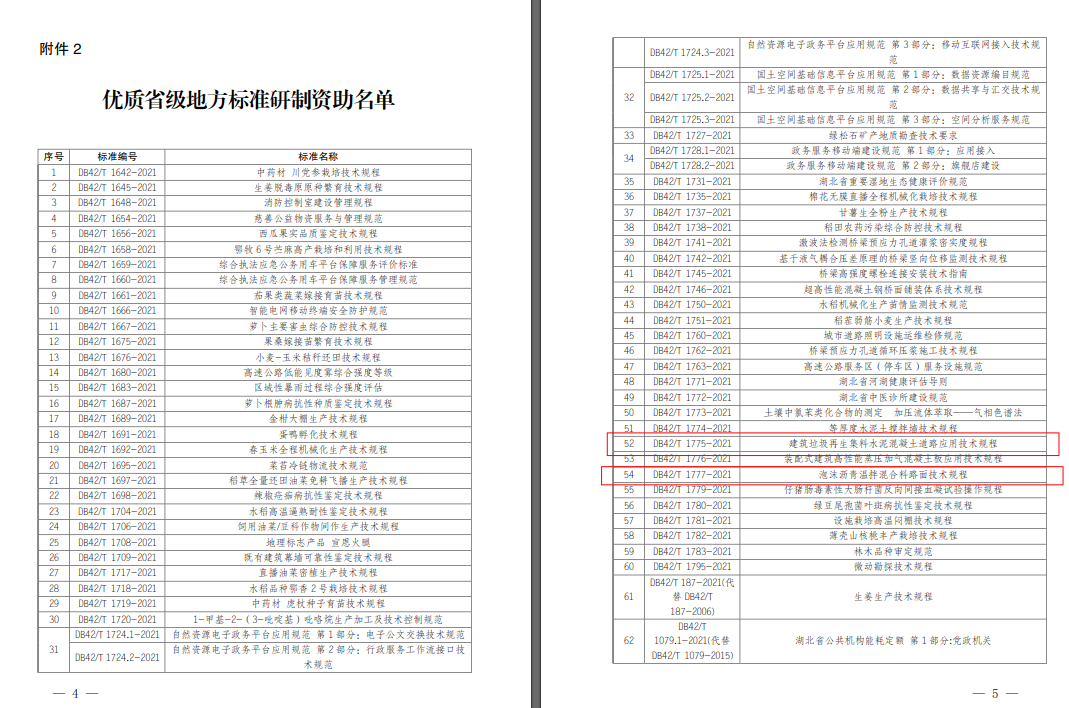 漢陽市政入選此次優(yōu)質(zhì)省地標為(《建筑垃圾再生集料水泥混凝土道路應(yīng)用技術(shù)規(guī)程》DB42/T 1775-2021、《泡沫瀝青溫拌混合料路面技術(shù)規(guī)程》DB42/T 1777-2021),主要涉及混凝土和瀝青材料的推廣應(yīng)用,標志著公司在垃圾資源化利用和泡沫瀝青的應(yīng)用推廣等方面得到行業(yè)認可,達到省內(nèi)領(lǐng)先水平,具有較高的推廣應(yīng)用價值,為將來在道路工程的新材料與綠色技術(shù)的研發(fā)和推廣提供有力支撐。