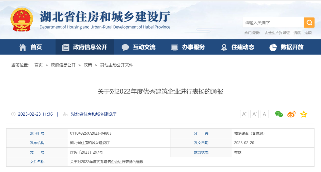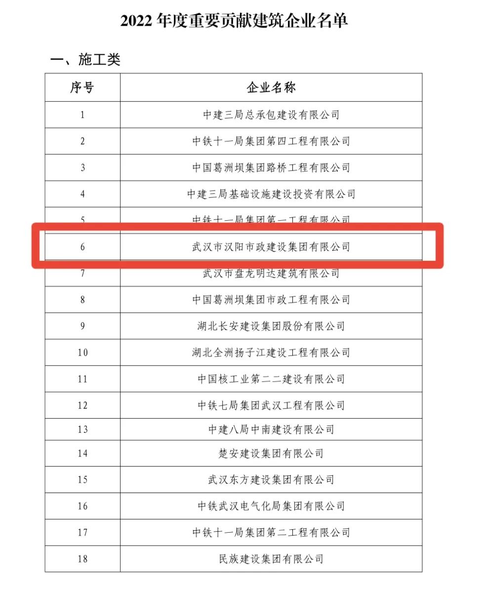 2月23日,湖北省住房和城鄉(xiāng)建設廳召開全省建筑業(yè)發(fā)展與管理工作會議,會上通報表揚26家突出貢獻企業(yè)和114家重要貢獻企業(yè)。漢陽市政榜上有名,獲評“湖北省2022年度重要貢獻建筑企業(yè)”。