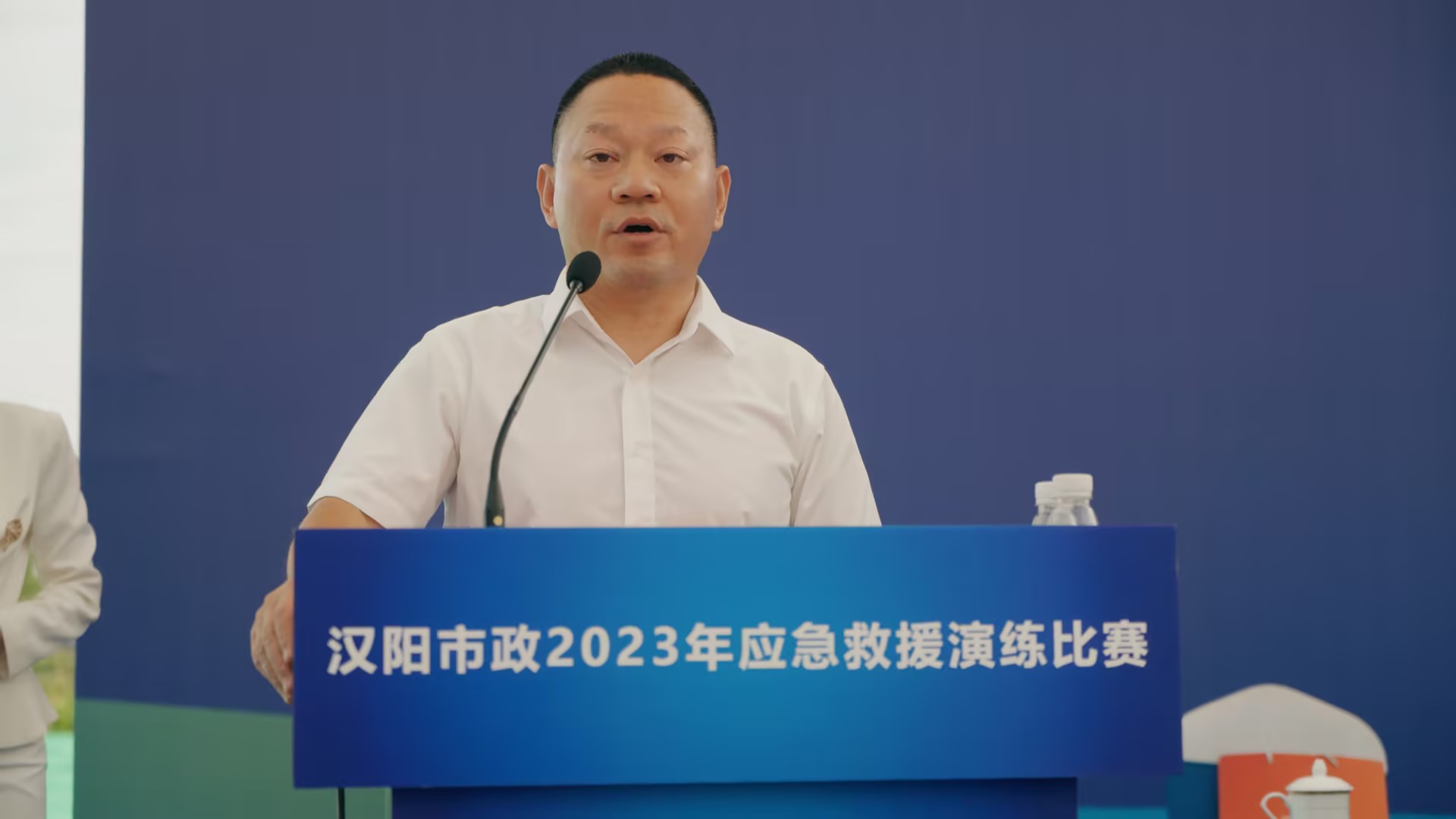 漢陽市政總工程師、演練活動總指揮荊武致辭。他提到,漢陽市政始終堅持“居安思危,穩(wěn)健拓新”的發(fā)展理念,堅持“安全生產,自覺規(guī)范”的安全理念,強化安全生產管理,切實維護人民群眾生命財產安全。希望各參賽隊伍規(guī)范落實救援動作,加強協(xié)作,凸顯漢陽市政優(yōu)秀的安全管理和應急救援水平。