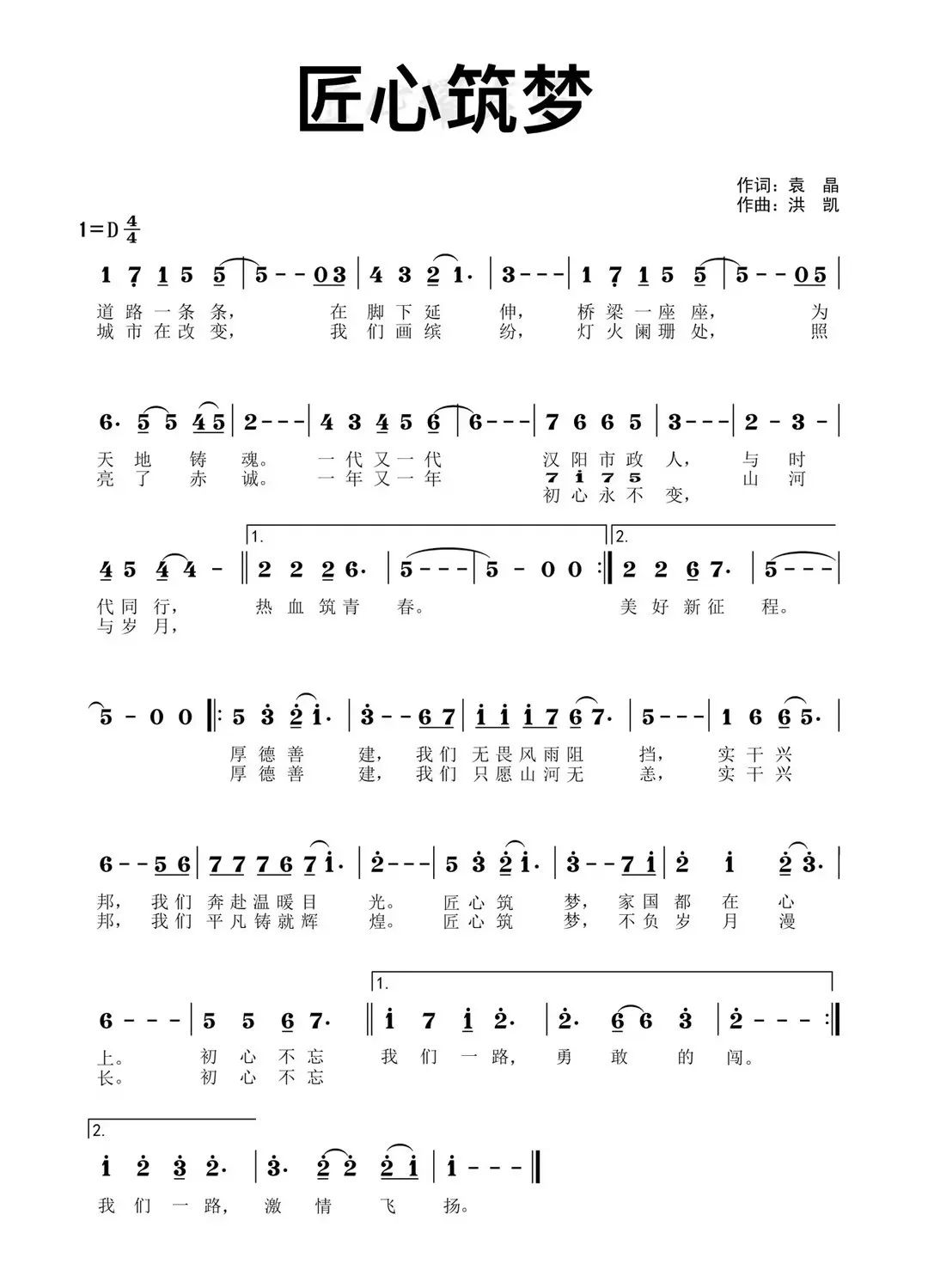 ? ?《匠心筑夢(mèng)》由袁晶作詞,洪凱作曲,節(jié)奏鏗鏘有力、雄壯昂揚(yáng),氣勢(shì)熱情澎湃、朝氣蓬勃。司歌承載著漢陽(yáng)市政人為國(guó)為民盡心盡責(zé)的不變初心,唱響了新一代漢陽(yáng)市政青年不負(fù)歲月用熱血繪就美好藍(lán)圖的壯志豪情。