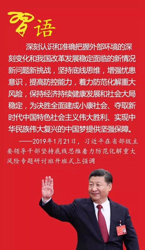 ——2019年1月21日,習(xí)近平在省部級(jí)主要領(lǐng)導(dǎo)干部堅(jiān)持底線思維著力防范化解重大風(fēng)險(xiǎn)專題研討班開班式上強(qiáng)調(diào)