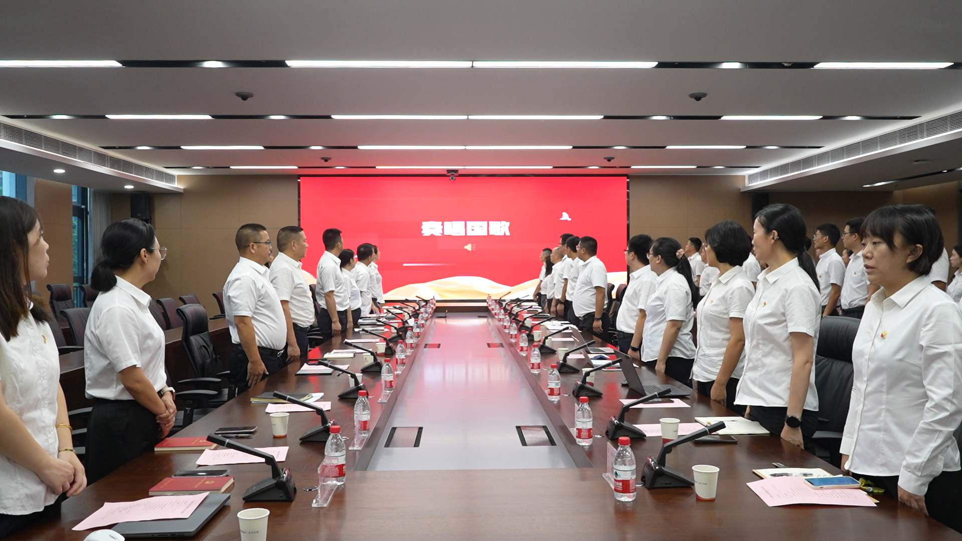 大會在莊嚴的國歌聲中拉開序幕,與會人員全體起立奏唱國歌。