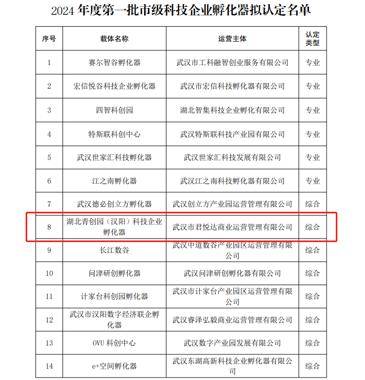 近日,武漢市科技創(chuàng)新局公示了《2024年度第一批市級(jí)科技企業(yè)孵化器認(rèn)定和眾創(chuàng)空間備案名單》,武漢市君悅達(dá)商業(yè)運(yùn)營有限公司運(yùn)營的湖北青創(chuàng)園(漢陽)科技企業(yè)孵化器榜上有名,這不僅是園區(qū)發(fā)展歷程中的重要里程碑,更是對(duì)武漢市君悅達(dá)商業(yè)運(yùn)營有限公司專業(yè)運(yùn)營實(shí)力的最佳注解。