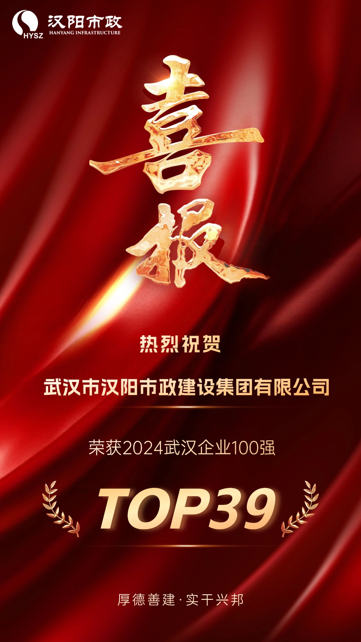 9月27日,武漢企業(yè)聯(lián)合會、武漢企業(yè)家協(xié)會和武漢發(fā)展戰(zhàn)略研究院聯(lián)合發(fā)布《2024武漢企業(yè)100強、制造業(yè)企業(yè)100強、服務業(yè)企業(yè)100強分析報告》。漢陽市政榮登武漢企業(yè)100強榜單第39位,相較上年再升7位!截至目前,漢陽市政已連續(xù)8年上榜武漢企業(yè)100強。