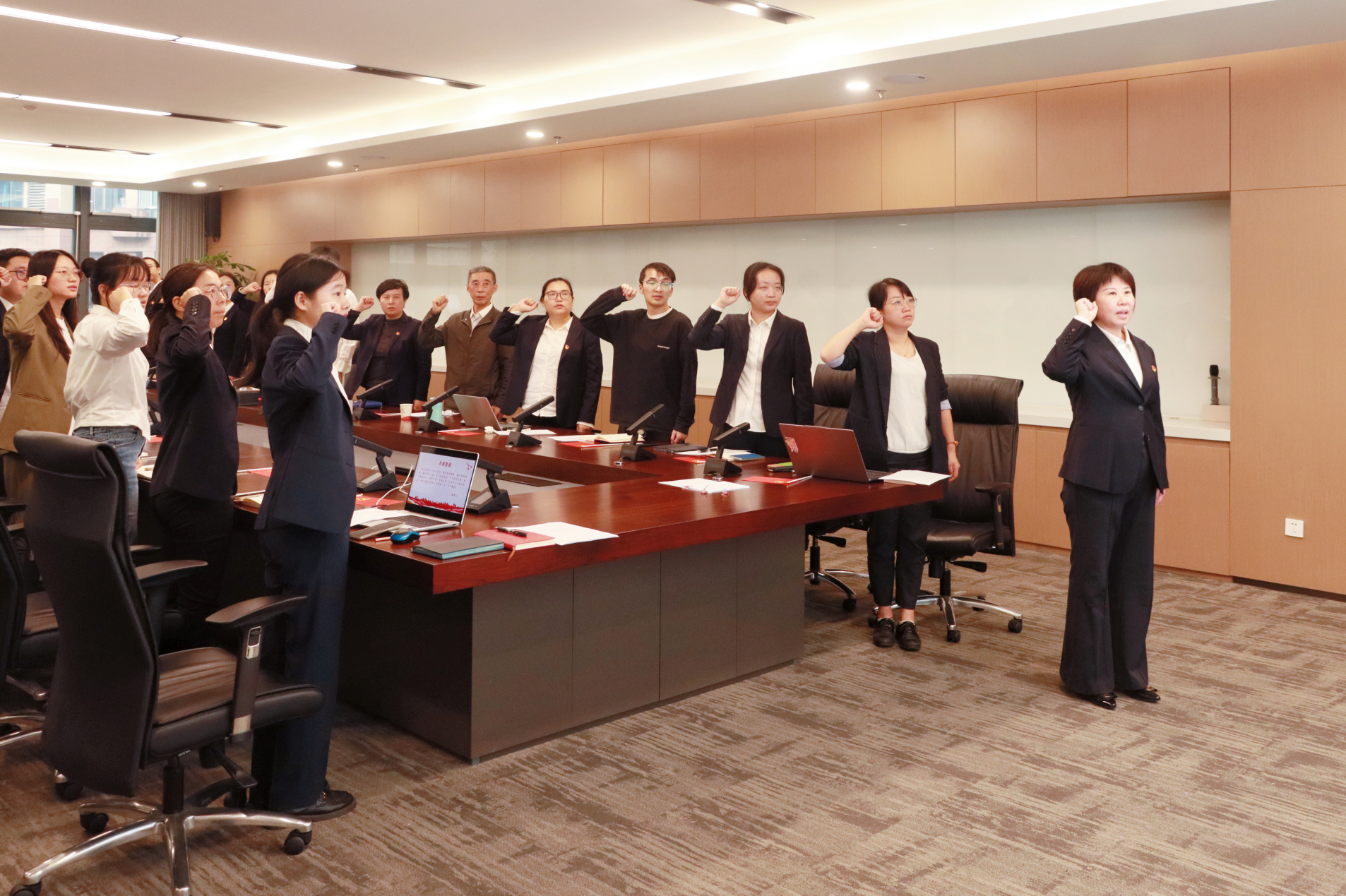 在紅色歌曲合唱環(huán)節(jié),全體黨員合唱經(jīng)典歌曲《我和我的祖國》,揮動著手中的黨旗,婉轉(zhuǎn)的旋律、激昂的歌聲在會議室回蕩,激起廣大黨員的愛黨愛國之情。