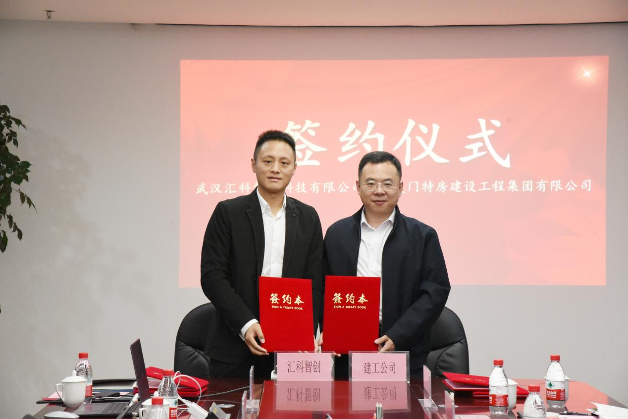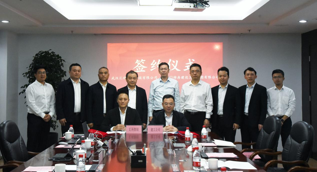 在廈門特區(qū)建投集團黨委書記、董事長李清華,黨委副書記、總經(jīng)理康激和武漢市漢陽市政建設集團有限公司黨委書記、董事長嚴悌文的見證下,建工公司黨委書記、董事長、總經(jīng)理李斌與匯科智創(chuàng)公司常務副總經(jīng)理向仕華代表雙方簽訂了關于成立合資公司的協(xié)議。